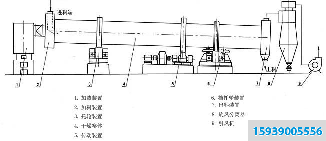 濕物料由皮帶輸送機(jī)或斗式提升機(jī)送到料斗,然后經(jīng)料斗的加料機(jī)通過(guò)加料管道進(jìn)入加料端。加料管道的斜度要大于物料的自然傾角,以便物料順利流入干燥器內(nèi)。干燥器圓筒是一個(gè)與水平線略成傾斜的旋轉(zhuǎn)圓筒。物料從較高一端加入,載熱體由低端進(jìn)入,與物料成逆流接觸,也有載熱體和物料一起并流進(jìn)入筒體的。隨著圓筒的轉(zhuǎn)動(dòng)物料受重力作用運(yùn)行到較底的一端。濕物料在筒體內(nèi)向前移動(dòng)過(guò)程中,直接或間接得到了載熱體的給熱,使?jié)裎锪系靡愿稍?,然后在出料端?jīng)皮帶機(jī)或螺旋輸送機(jī)送出。在筒體內(nèi)壁上裝有抄板,它的作用是把物料抄起來(lái)又撒下,使物料與氣流的接觸表面增大,以提高干燥速率并促進(jìn)物料前進(jìn)。載熱體一般分為熱空氣、煙道氣等。載熱體經(jīng)干燥器以后,一般需要旋風(fēng)除塵器將氣體內(nèi)所帶物料捕集下來(lái)。如需進(jìn)一步減少尾氣含塵量,還應(yīng)經(jīng)過(guò)袋式除塵器或濕法除塵器后再放排放。