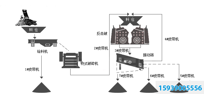 首先從山上爆破下來的石頭通過喂料機均勻地喂入顎式破碎機初步破碎,經(jīng)粗碎后的半成品通過皮帶輸送機輸送至反擊式破碎機進(jìn)一步破碎,二次破碎后的石料通過皮帶輸送機輸送至振動篩篩分出不同規(guī)格的石子,滿足客戶粒度要求的石子通過皮帶輸送機輸送至成品料堆,大于上層篩網(wǎng)尺寸的石子通過皮帶輸送機重新返回至反擊式破碎機再次破碎,形成閉路循環(huán)。