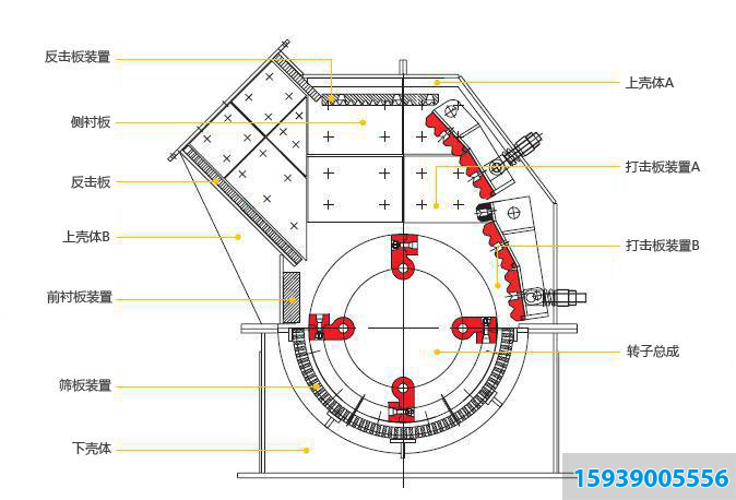 電動機帶動轉(zhuǎn)子在破碎腔內(nèi)高速旋轉(zhuǎn)。物料自上部給料口給入機內(nèi),受高速運動的錘子的打擊、沖擊、剪切、研磨作用而粉碎。在轉(zhuǎn)子下部,設(shè)有篩板,粉碎物料小于篩孔尺寸的粒級通過篩板排出,大于篩孔尺寸的粗粒級阻留在篩板上繼續(xù)受到錘子的打擊和研磨, **通過篩板排出機外。