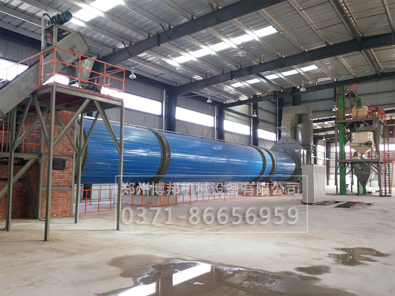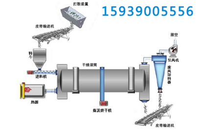 在烘干機(jī)頂部熱風(fēng)溫度達(dá)700-800℃的狀態(tài)下,物料由提升機(jī)從喂料口喂入,在重力作用下由截流器連續(xù)均勻滑落。熱氣體由下部熱風(fēng)爐生成,從下向上運(yùn)動(dòng),與物料相接觸,通過(guò)熱導(dǎo)、對(duì)流、輻射等多種方式將熱量傳遞給物料,從而使物料溫度不斷升高,水份不斷被蒸發(fā)。**終符合水份要求的物料從內(nèi)外筒之間的烘干區(qū)下部出料口卸料。