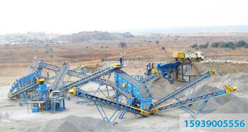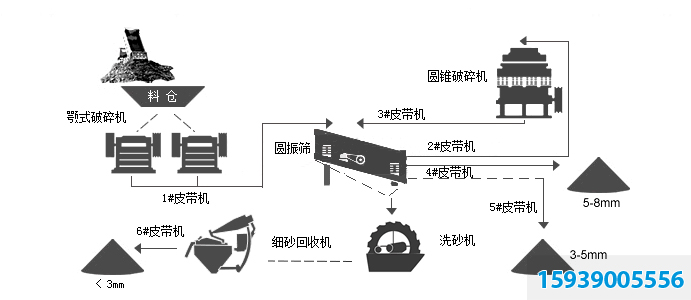 大塊石料經(jīng)料倉由振動給料機均勻地送進鄂式破碎機進行粗碎,粗碎后的石料由膠帶輸送機送到圓錐破碎機進行進一步破碎;細碎后的石料由膠帶輸送機送進振動篩進行篩分,篩分出幾種不同規(guī)格的石子,滿足粒度要求的石子由成品膠帶輸送機送往成品料堆;不滿足粒度要求的石子由膠帶輸送機返料送到圓錐破碎機進行再次破碎,形成閉路多次循環(huán)。成品粒度可按照用戶的需求進行組合和分級,為保護環(huán)境,可配備輔助的除塵設備。